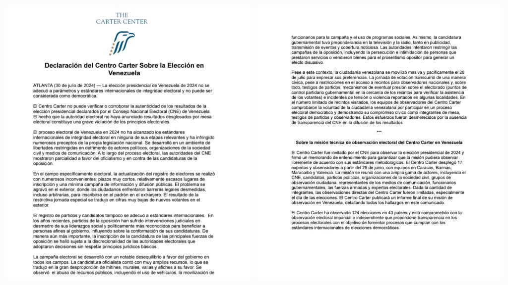 El Centro Carter fue uno de los pocos observadores internacionales que fueron autorizados a presenciar los comicios, y dicha organización reconoció que estos no cumplieron con los estándares internacionales necesarios para considerarse democráticos. Confirmó la restricción de libertades de contrincantes políticos y población civil en general, la omisión de información detallada acerca de los resultados y el sesgo de las instituciones involucradas en el proceso, además de constatar trabas para el voto desde el extranjero y percibir una clara desigualdad de condiciones para los candidatos que participaron en la campaña electoral debido al alto financiamiento y visibilidad con el que contó el oficialismo.