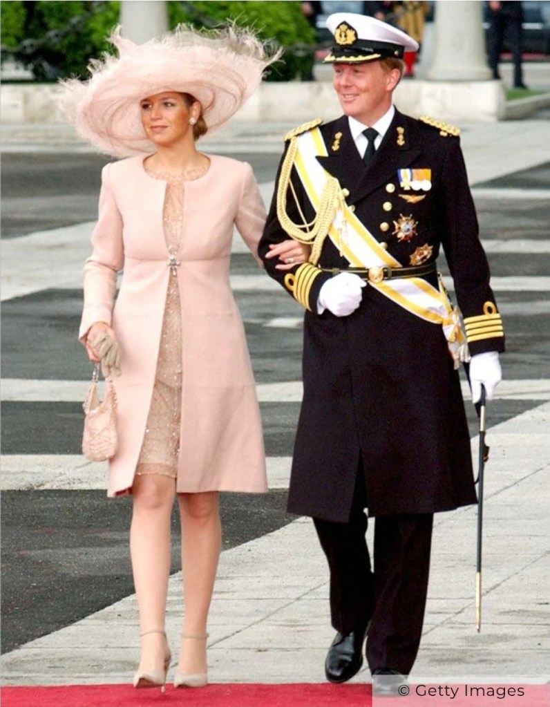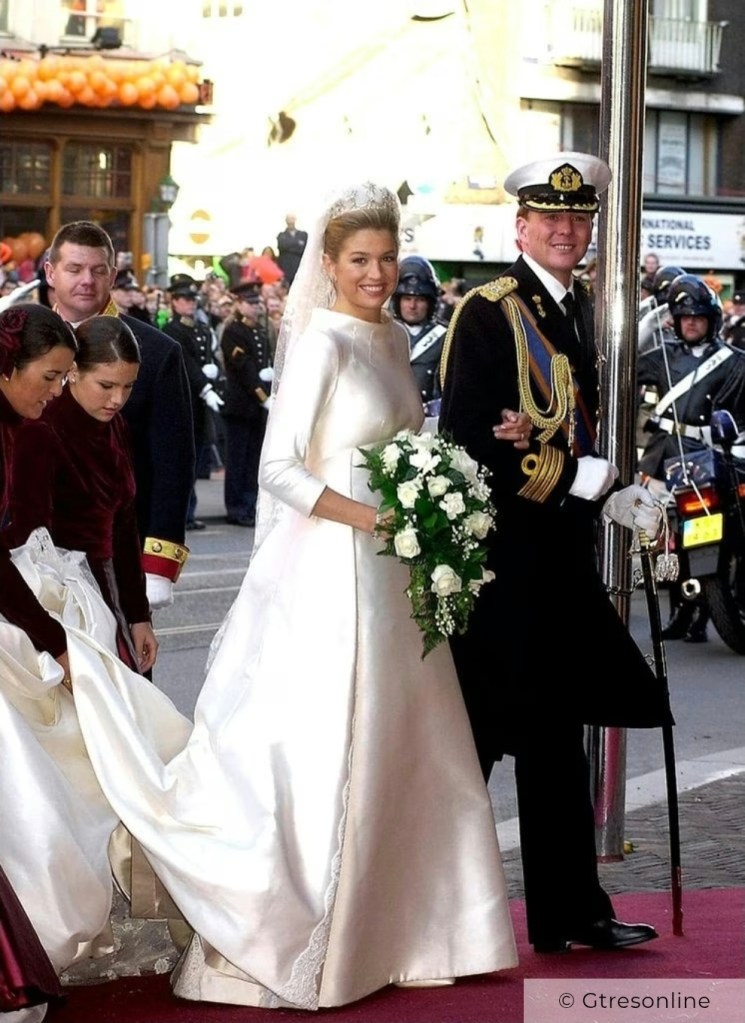 ● Imagen 1 – Vestido de novia: En febrero de 2002, se casó con el rey Guillermo luciendo un diseño valorado en 100.000 euros y firmado por la casa italiana Valentino. Por su sencillez y falta de estridencias, contrasta mucho con lo que es su estilo habitual. Confeccionado en seda mikado, con discreto escote redondeado, mangas francesas y cuerpo liso, solo sumaba dos apliques de encaje a ambos lados de la falda. Sin embargo, los detalles estuvieron en su cola de cinco metros, en el velo de tul floral artesanal y, sobre todo, en su tiara. La pieza fue un guiño a la Casa Orange-Nassau: la había llevado la reina Beatriz en su enlace con el príncipe Claus en el año 1966, pero fue rescatada y modificada exclusivamente para Máxima.