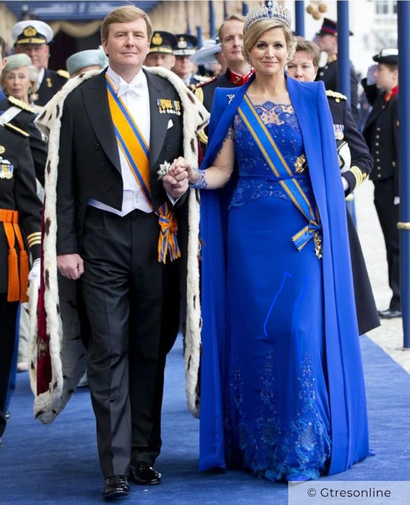 ● Imagen 3 – Ascenso al trono: El 30 de abril de 2013, Guillermo y Máxima se convertían en los nuevos reyes de Países Bajos. Para uno de los tantos actos que se llevaron a cabo esa jornada, la monarca optó por llevar un vestido de color azul klein confeccionado por Jan Taminiau. A la sofisticada prenda —que contaba con apliques artesanales de pedrería y cristal— se le añadió una elegante capa en el mismo tono. El accesorio más destacado fue, sin lugar a dudas, su corona de zafiros.