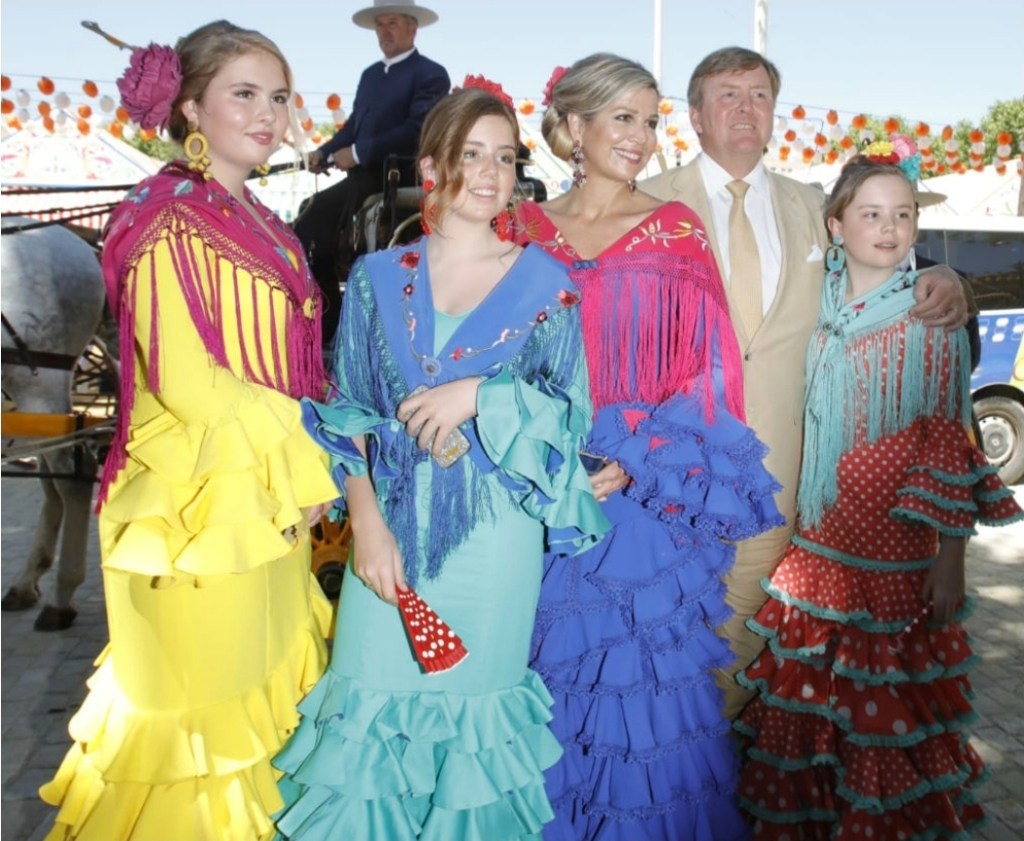 ● Imagen 4 – España como cuna del amor: En 2019, justo 20 años después de haberse conocido, Máxima y su esposo Guillermo acudieron a la Feria de Abril de Sevilla. No lo hicieron en solitario, sino con sus tres hijas. Lo curioso es que las cuatro mujeres de la familia portaron trajes de flamenca (vestimenta típica del evento) diseñados por la casa española Fabiola 1987. El gesto evidenció la enorme importancia simbólica que tiene la ciudad andaluza para toda la familia.