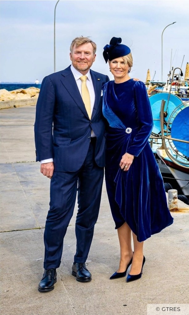 ● Imagen 7 – Moda sostenible y joyería con historia: En una visita de Estado a Chipre en 2025, se decantó por lucir un vestido de largo midi con bajo asimétrico que ya había estrenado dos años atrás. Al modelo —confeccionado en terciopelo azul y diseñado por el griego Christos Costarellos— le añadió accesorios y complementos a juego: un tocado de origen irlandés (estrenado en 2023), unos zapatos de tacón del italiano Gianvito Rossi (estrenados en 2017), un bolso de mano de su casa belga de confianza Natan (estrenado en 2018), y joyas de diamantes y zafiros.